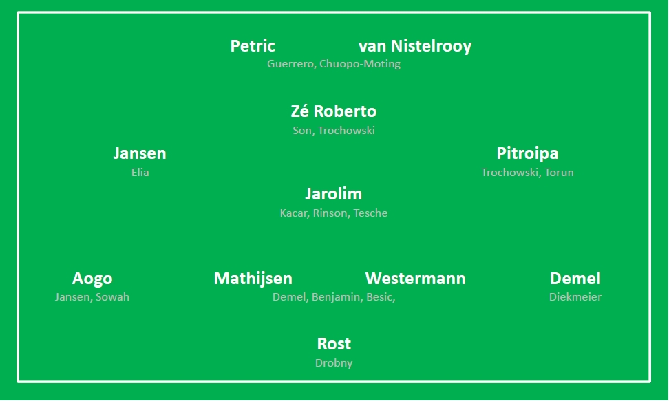 Das derzeitig vom Trainer favorisierte 4-2-3-1 System gefällt mir nicht. Es scheitert meiner Meinung nach vor allem daran, daß wir keinen Spieler haben der auf die mittlere Position im Mittelfeld paßt. Es wurden in 6 Spielen 4 Spieler in der folgendenden Reihenfolge ausprobiert: Petric, Guerrero, Trochowski, Aussetzer da 4-1-4-1 gespielt, Petric, Elia. Keiner der Spieler konnte auf der Position überzeugen. Die Statistik zeigt, daß auf der mittleren Position im dreier Mittelfeld die wenigsten Minuten im Schnitt gespielt werden. Also ist der Trainer in fast jedem Spiel mit dem gezeigten Leistungen nicht zufrieden.