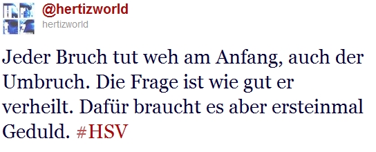 Ist der Umbruch eventuell eine Ausrede für die Spieler, die trotz des Umbruchs immer noch auf dem Platz stehen? Immerhin standen aus der Elf des letzten Spiels gegen München (Rost – Rincón, Kacar, Westermann, Aogo – Jarolim, Zé Roberto, Ben-Hatira, Elia – Petric, Guerrero; Jansen, Tesche) weiterhin noch 8 Spieler auf dem Platz, 6 davon von Beginn an. Drobny, Diekmeier – Mancienne – Bruma – Aogo, Rincón – Jarolim – Westermann – Jansen, Töre – Son; Tesche – Kacar – Elia)
