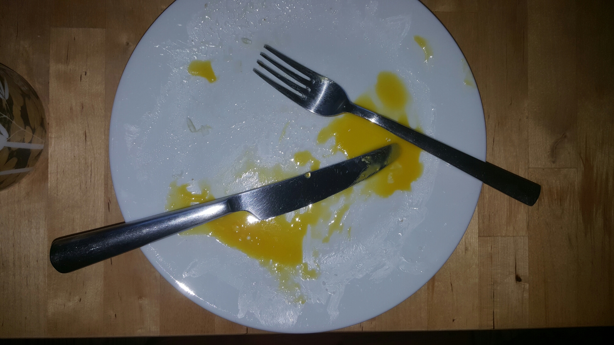 Morgens habe ich der Juniorette 2 Spiegeleier gemacht. Dabei habe ich mich sehr darüber aufgeregt, dass sie noch nicht „richtig“ mit Messer und Gabel essen kann.