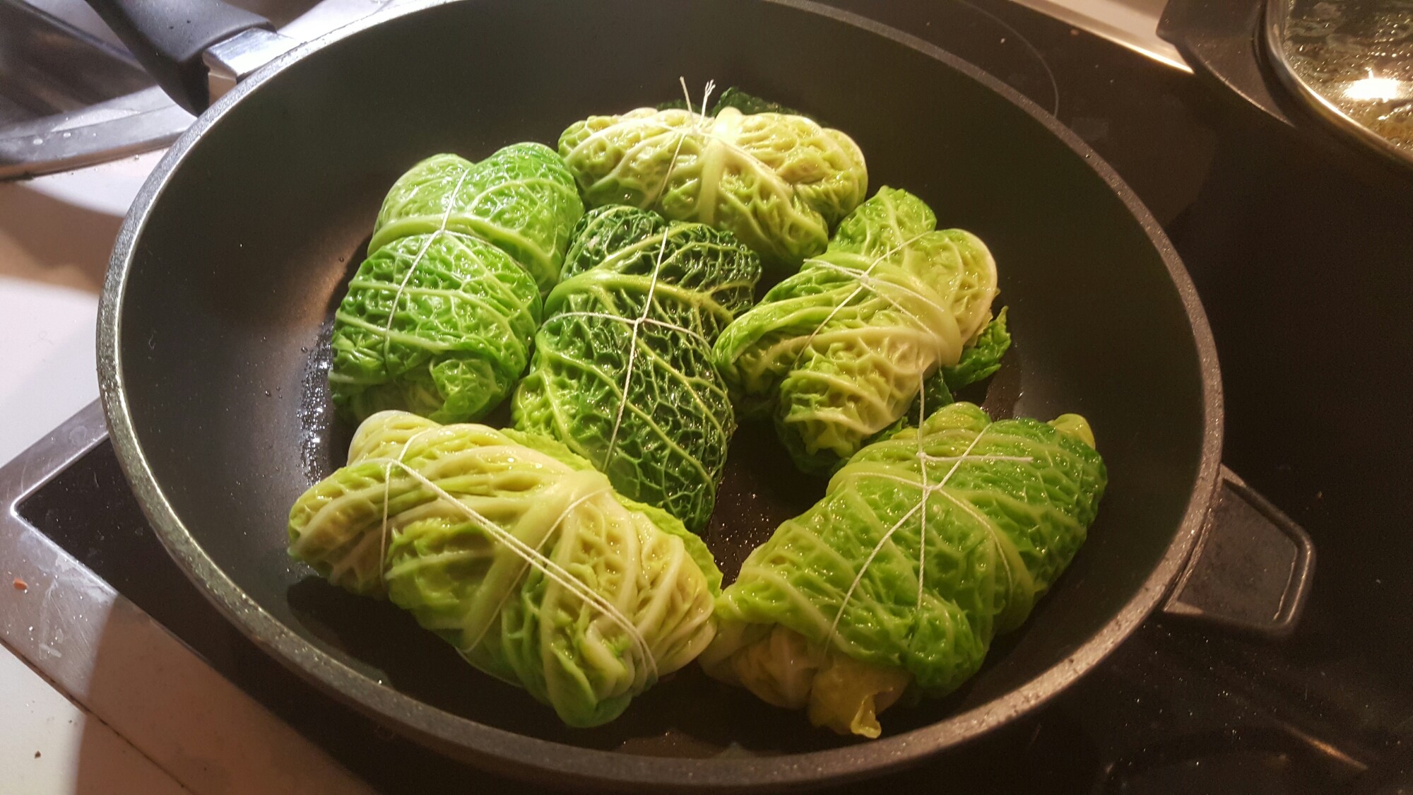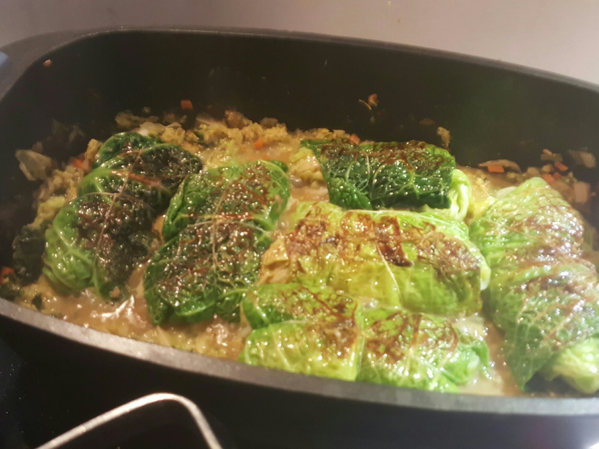 Dann am besten jemanden haben, der 6 große Blätter Wirsing kurz blanchiert und abschreckt um leckere Rouladen zu wickeln. Mit Garn fixieren und von allen Seiten scharf anbraten.