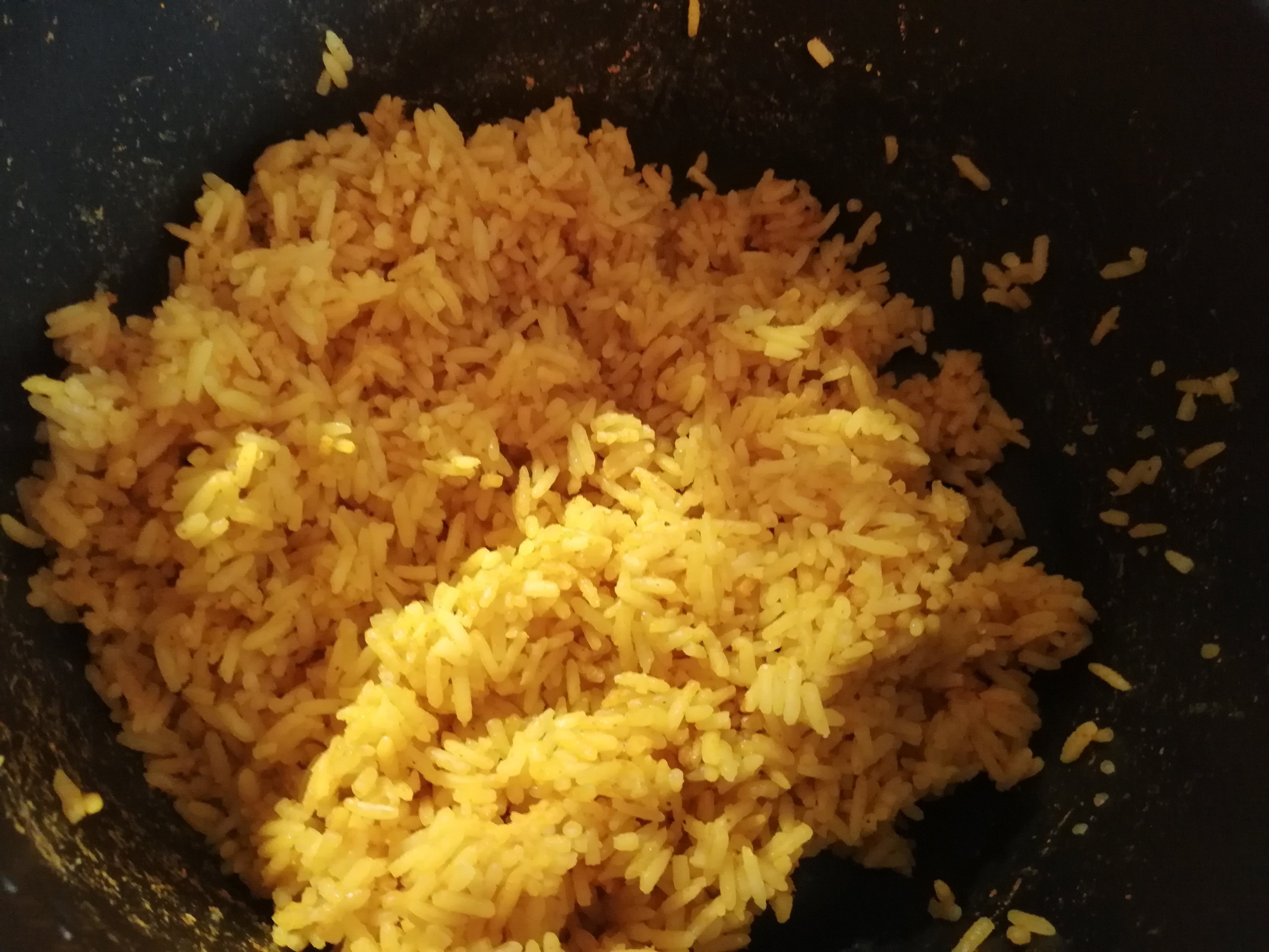 Der Reiskocher ist der Hammer, vielen Dank nochmal. Den Jasmin Reis habe ich mit Kurkuma, Garam Massalla und Bockshorn aromatisiert. Dazu Restgemüse und Eier, lecker.
