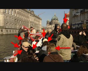 Platz draußen auf dem Oberdeck war schnell besetzt und los ging die lustuige Fahrt … in die falsche Richtung. Da drei Schiffe gemeinsam die Spree entlangschippern wollten, mußten wir erstmal in die falsche Richtung, was uns nicht Berlinern natürlich allen sofort aufgefallen ist..